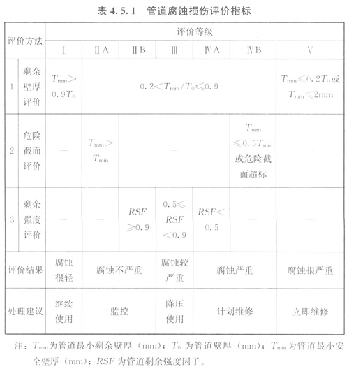 451管道腐蝕損傷評價的方法應(yīng)符合現(xiàn)行行業(yè)標(biāo)準《鋼制管道及儲罐腐蝕評價標(biāo)準埋地鋼質(zhì)管道外腐蝕直接評價》SYT00871的有關(guān)規(guī)定。當(dāng)采用剩余壁厚、危險截面和剩余強度三個層次逐級評價時,管道腐蝕損傷評價指標(biāo)應(yīng)符合表451的規(guī)定。