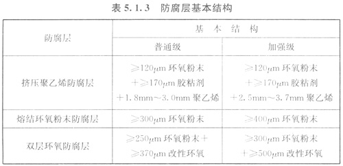 513管道防腐層宜采用擠壓聚乙烯防腐層、熔結(jié)環(huán)氧粉末防腐層、雙層環(huán)氧防腐層等,普通級和加強級的防腐層基本結(jié)構(gòu)應(yīng)符合表513的規(guī)定。