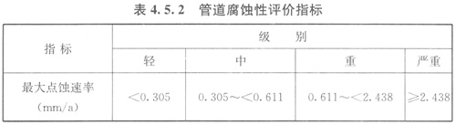 452管道腐蝕速率應(yīng)采用最大點蝕速率指標(biāo)進行評價。管道腐蝕性評價指標(biāo)應(yīng)符合表452的規(guī)定。