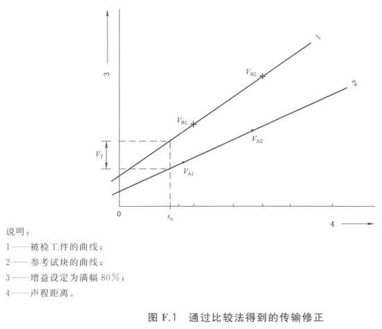 將探頭置于參考試塊上,分別將第一次和第二次底波調(diào)整至示波屏的同一高度,并記下相應(yīng)的增益值(VA1VA2見圖F1)。依據(jù)增益值與聲程距離的關(guān)系繪制出圖G1中的線2。然后將探頭重新置于工件上,重復(fù)上述步驟得到(VB1,VB2和圖F1中的線1)。對應(yīng)適當(dāng)?shù)穆暢?span style=";padding: 0px">(su),通過兩線得出增益差值,即傳輸修正(DVt),見圖F1。