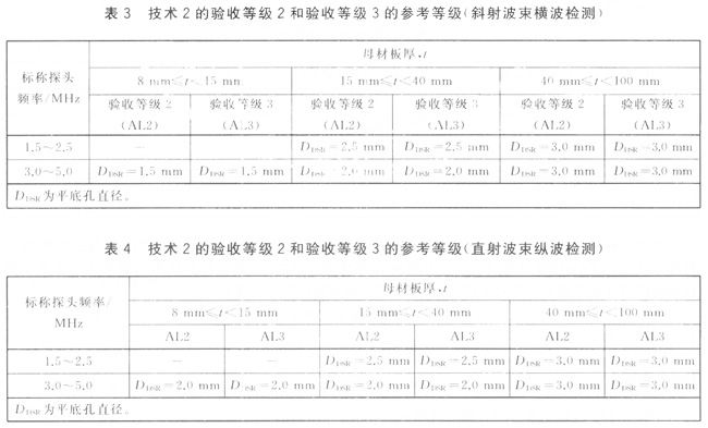b)技術(shù)2:以規(guī)定尺寸的平底孔(見表3和表4)作為基準反射體的,制作縱波/橫渡距離-增益尺寸曲線(DGS)。