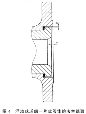 5.3.1.2 一片式法蘭球閥(如圖1所示)非完整密封面的要求:內(nèi)裝閥座從閥體一側(cè)法蘭端的流道裝入并固定在閥體內(nèi),該閥座與閥體的間隙見圖4,尺寸a應(yīng)該不超過0.25mm,尺寸b應(yīng)不超過1.5mm。