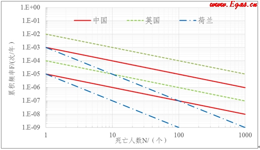 將三個典型國家(地區(qū))的社會可接受風險標準相比較,可看出中國香港地區(qū)的社會可接受風險標準比荷蘭的要求低,但比英國的要求高。總體看中國香港的社會可接受風險標準在發(fā)達國家和地區(qū)的風險標準處于中等水平。