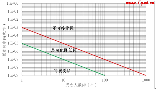 個人可接受風險標準描述的是危化裝置周圍某一固定位置處單個人員對風險的可接受水平,社會可接受風險標準是?;b置周邊一定范圍內(nèi)社會公眾整體對風險的可接受水平。社會可接受風險標準是對個人可接受風險標準的補充,為避免當個人風險滿足標準要求時,由于人口密度過高導致的群死群傷事故概率超過公眾可接受范圍。例如100年發(fā)生1次死亡100人的事故和100年發(fā)生100次1人死亡的事故的個人風險相同,但我們要采取措施進一步避免1次死亡100人的事故發(fā)生,因此對危險源周邊的人口密集區(qū)域需要從社會風險的角度提出補充要求。