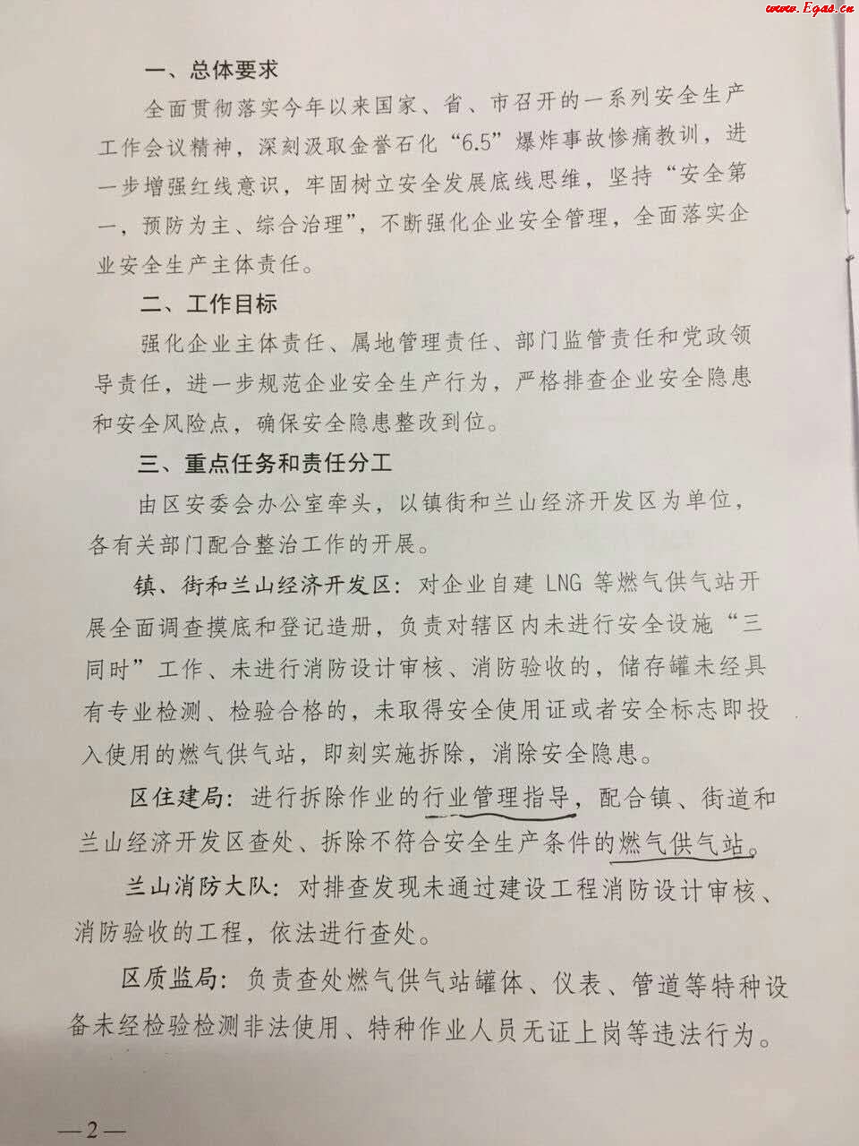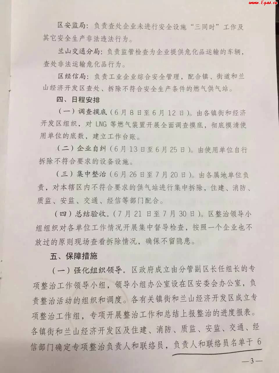 臨沂市蘭山區(qū)人民政府下發(fā)了關(guān)于開展企業(yè)自用LNG設(shè)備等燃?xì)獍踩珜m椪涡袆拥耐ㄖMㄖ鞔_了鎮(zhèn)、街和蘭山經(jīng)濟開發(fā)區(qū)、區(qū)住建局、蘭山消防大隊、區(qū)質(zhì)監(jiān)局、區(qū)安監(jiān)局、蘭山交通分局以及區(qū)經(jīng)信局等各部門的主要任務(wù)和責(zé)任分工,其中區(qū)住建局進行拆除作業(yè)的行業(yè)管理指導(dǎo),而鎮(zhèn)、街道和蘭山經(jīng)濟開發(fā)區(qū)具體執(zhí)行拆除作業(yè)。此外,通知還明確了專項整治行動的各個時間節(jié)點,企業(yè)自行拆除和各屬地單位集中拆除的時間節(jié)點需要注意。