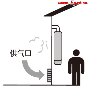 • ① 確保安裝場所留有大于130cm²面積的進、排氣窗口。進、排氣口分別設(shè)在接近地面和天花板的位置,并能夠與戶外直接連通。進氣口應(yīng)盡可能遠離器具的排煙管,防止煙氣倒流到安裝器具的房間內(nèi)。