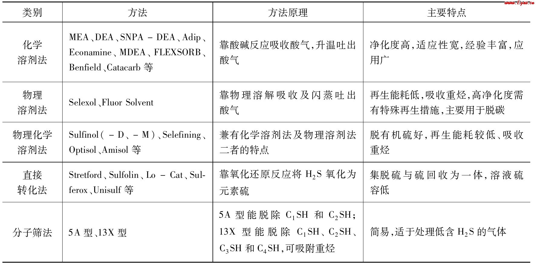 用于天然氣液化過程中脫除酸性組分的方法有化學溶劑法、物理溶劑法、物理化學溶劑法、直接轉化法、分子篩法等。表2-2給出了有代表性的方法及其脫硫原理與主要特點。