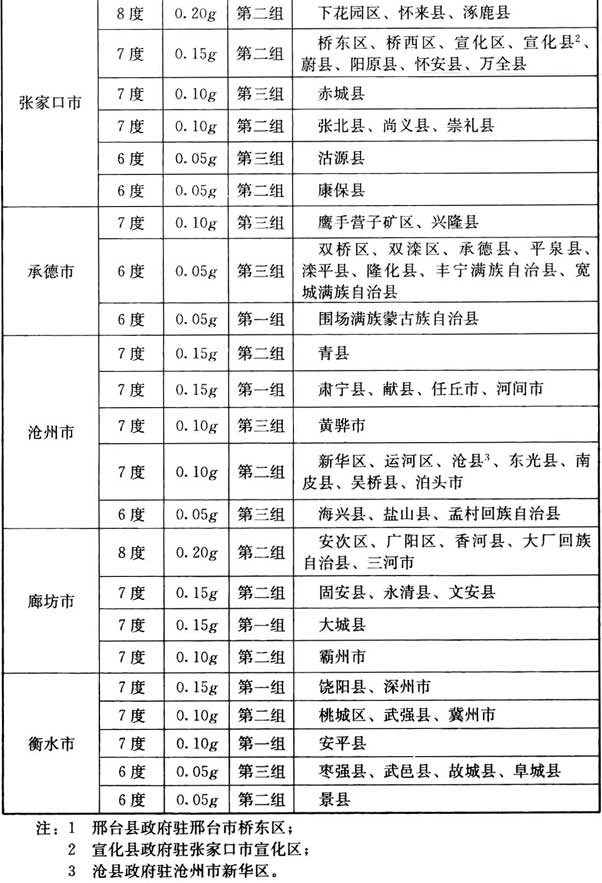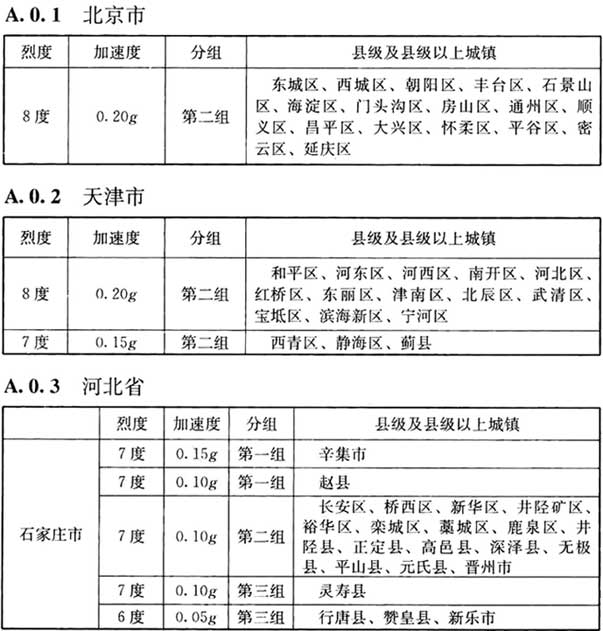 本附錄僅提供我國各縣級及縣級以上城鎮(zhèn)地區(qū)建筑工程抗震設計時所采用的抗震設防烈度(以下簡稱“烈度”)、設計基本地震加速度值(以下簡稱“加速度”)和所屬的設計地震分組(以下簡稱(“分組”)。本表摘自《建筑抗震設計規(guī)范》 GB50011-2010(2016年版)附錄A