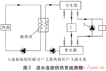混水連接的工藝結(jié)構(gòu)簡(jiǎn)潔,降低了熱網(wǎng)造價(jià),循環(huán)泵的耗電量低,節(jié)省運(yùn)行費(fèi)用。隨著供熱系統(tǒng)逐漸完善,在擴(kuò)增或新建的供熱區(qū)域,采用大混合比的混水連接方式,特別是針對(duì)不同供暖方式的用戶無(wú)疑成為首要考慮的連接方式。