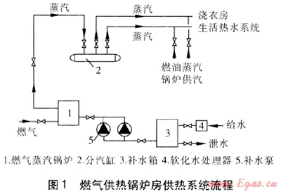 該酒店裙樓地下共有3層,其中地下一層的原發(fā)電機(jī)組儲(chǔ)油庫(kù)現(xiàn)已停止使用,建筑面積約60m2,緊鄰地下一層出口坡道,距燃?xì)膺M(jìn)戶管道8m,經(jīng)改造后,可作為燃?xì)夤徨仩t房。燃?xì)夤徨仩t房供熱系統(tǒng)流程見(jiàn)圖1。