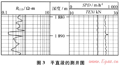 圖3為資料中感應(yīng)電阻率曲線(RILD)及同次測(cè)井帶測(cè)的張力曲線(TEN)、速度曲線(SPD)。軟件利用曲線擬合法檢查出1888.11~1889.21m為平直段(幅度值均為0.2Ω·m,該段相對(duì)均方差為0),同時(shí)張力曲線和速度曲線在相應(yīng)的深度段沒(méi)有明顯異常,說(shuō)明并不是因?yàn)閮x器遇卡現(xiàn)象引起的平直段.因此軟件判斷1888.11~1889.21m為平直異常。