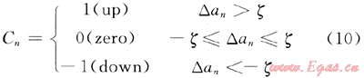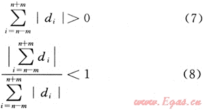 式(7)說(shuō)明在第n個(gè)點(diǎn)附近存在較大變化,在滿足式(7)的同時(shí)滿足式(8)說(shuō)明在該點(diǎn)附近也存在較大的反向變化,可判斷為“跳動(dòng)”。