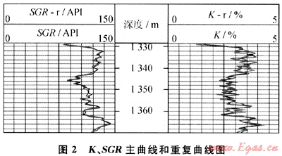 圖2為資料中深度校正后的總自然伽馬(SGR)、鉀含量(K)曲線的主曲線和重復(fù)曲線圖,石油天然氣行業(yè)標(biāo)準(zhǔn)SY/T 5132—2003《測(cè)井原始資料質(zhì)量要求》中對(duì)自然伽馬能譜測(cè)井重復(fù)性的要求為:重復(fù)曲線與主曲線形狀基本相同,總自然伽馬重復(fù)測(cè)量值相對(duì)誤差應(yīng)小于5%,鉀的重復(fù)測(cè)量值相對(duì)誤差應(yīng)小于10%。結(jié)合企業(yè)生產(chǎn)實(shí)際,約定重復(fù)誤差符合標(biāo)準(zhǔn)的井段總長(zhǎng)度不得少于45m(常規(guī)測(cè)井重復(fù)曲線至少測(cè)50m,50m時(shí)90%要符合標(biāo)準(zhǔn),即50×90%=45m)。軟件經(jīng)計(jì)算得:曲線SGR重復(fù)曲線與主曲線相關(guān)系數(shù)為0.983,曲線校深后,重復(fù)誤差符合標(biāo)準(zhǔn)的井段總長(zhǎng)度為53.5m;曲線K重復(fù)曲線與主曲線相關(guān)系數(shù)為0.765,校深后,重復(fù)誤差符合標(biāo)準(zhǔn)的井段總長(zhǎng)度為36.5m。因此,軟件得到重復(fù)性檢查結(jié)論:曲線SGR合格,曲線K不合格。