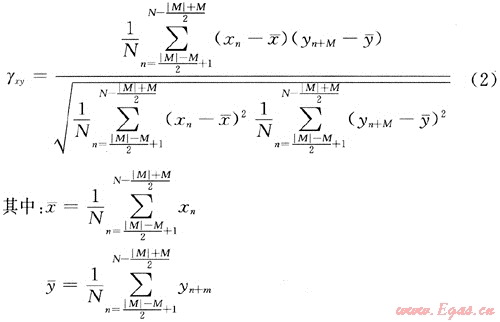M是Yn相對(duì)于Xn的深度差(采樣點(diǎn)數(shù)差),式(2)在M<<N時(shí)適用。以M為變量,在適當(dāng)?shù)乃阉鞔伴L(zhǎng)內(nèi)變化,則當(dāng)M正好為yn相對(duì)于xn的實(shí)際深度差時(shí),計(jì)算得到的γxy應(yīng)為最大。以此反推,在搜索窗長(zhǎng)范圍內(nèi),當(dāng)計(jì)算的相關(guān)系數(shù)最大時(shí),M即為yn相對(duì)于xn的實(shí)際深度差(采樣點(diǎn)數(shù)差)。