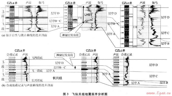 圖3是開(kāi)江-梁平海槽西側(cè)分別位于臺(tái)地、生物巖隆和海槽的3口井的連井圖,利用測(cè)井資料與地震資料將飛一段至飛三段劃分出4套地震層序,合成地震記錄中黃色區(qū)域?yàn)閮?chǔ)層段。層序A為高位早期,水體較深,儲(chǔ)層基本不發(fā)育。層序B-C為高位晚期,儲(chǔ)層開(kāi)始發(fā)育,CZLb井位于臺(tái)緣帶上,儲(chǔ)層段聲波曲線(xiàn)明顯降低,其儲(chǔ)層厚度較大,合成記錄上儲(chǔ)層底部地震反射明顯增強(qiáng);開(kāi)闊臺(tái)地內(nèi)CZLa井在層序B-C內(nèi)雖有一定的儲(chǔ)層發(fā)育,但厚度明顯變薄,合成記錄上儲(chǔ)層底部反射異常與臺(tái)緣帶反射相比異?,F(xiàn)象降低;位于深水海槽內(nèi)CZLc井在層序B-C內(nèi)無(wú)儲(chǔ)層發(fā)育。