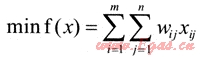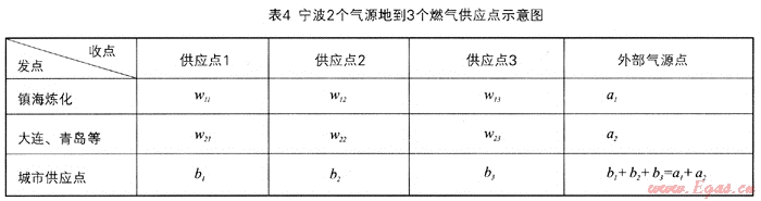 假設(shè)有m個(gè)外來(lái)氣源點(diǎn),n個(gè)該城區(qū)燃?xì)夤?yīng)(銷售)點(diǎn)。則令以a1,a2,…am表示各外來(lái)氣源點(diǎn)運(yùn)至該市的輸出量,b1,b2,…,bn表示各供應(yīng)(銷售)點(diǎn)的燃?xì)馊菁{量(銷售量),有∑ai=∑bj。xij表示氣源地i運(yùn)往供應(yīng)點(diǎn)j的運(yùn)氣量,wij表示相應(yīng)的單位運(yùn)氣量的運(yùn)輸時(shí)間(單位運(yùn)氣量的運(yùn)輸時(shí)間因運(yùn)輸方式的不同而改變),如表2所示