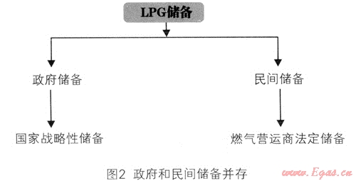 目前世界上的LPG儲(chǔ)備主要有兩種儲(chǔ)備模式:如美國(guó),有多家資本雄厚的大型燃?xì)饽茉唇?jīng)營(yíng)企業(yè),這些企業(yè)自發(fā)建立大量?jī)?chǔ)備;如日本、韓國(guó),由政府和民間共同承擔(dān)LPG儲(chǔ)備。國(guó)家建立公共儲(chǔ)備的同時(shí),強(qiáng)制企業(yè)建立一定的商業(yè)儲(chǔ)備。如圖2所示