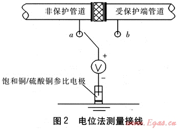 在絕緣接頭性能良好的情況下,點(diǎn)b處電位Vb在數(shù)值上和管道陰極保護(hù)電位相近(-850~-1200mV),點(diǎn)a處電位Va在數(shù)值上與管道自然電位相近。根據(jù)測(cè)量結(jié)果,若Vb明顯地比Va更小(電位差的絕對(duì)值為200~500mV),則認(rèn)為絕緣接頭的絕緣性能良好。如果電位差的絕對(duì)值小于200mV,則應(yīng)該使用其他檢測(cè)方法進(jìn)一步測(cè)量怕-,以確定絕緣接頭是否失效。