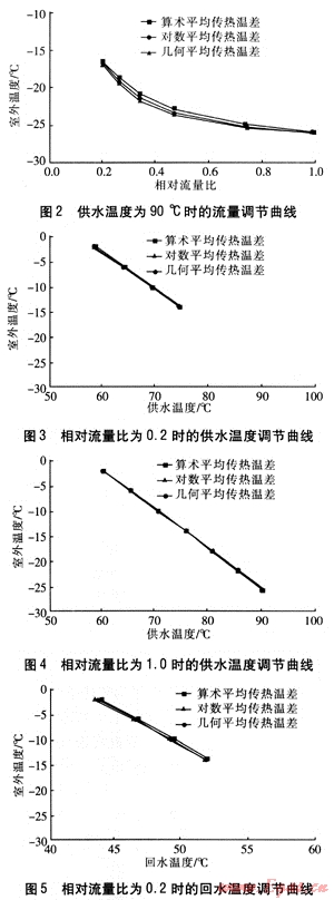 由圖1、2可知,分別采用這3種形式的平均傳熱溫差時,不同供水溫度條件下對應(yīng)的水溫、流量調(diào)節(jié)曲線很接近。這主要是由于分別采用這3種形式平均傳熱溫差的散熱器熱流量計算式的擬合效果基本相同。