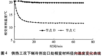 供熱工況下制冷劑入口處相變材料徑向溫度變化曲線見(jiàn)圖3。由圖3可知,在供熱工況下,系統(tǒng)開(kāi)始運(yùn)行初期,相變材料徑向各節(jié)點(diǎn)間溫度的差異較大,鄰近制冷劑管壁的節(jié)點(diǎn)A溫度下降較快,而與水管壁相鄰的節(jié)點(diǎn)B溫度幾乎不變,直至30min后相變材料溫度場(chǎng)達(dá)到穩(wěn)定狀態(tài),之后沿徑向各個(gè)節(jié)點(diǎn)的相對(duì)溫差固定。