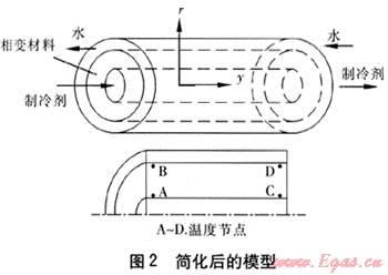 三套管相變蓄能換熱器是一種新型的集成節(jié)能設(shè)備,與普通套管換熱器相比,增加了安裝在內(nèi)外管間的中間層相變材料,這樣就將普通套管換熱器換熱功能與相變材料的蓄熱功能有機(jī)地結(jié)合[1]。相變材料的合理選擇決定著三套管相變蓄能換熱器的蓄熱效果,因此應(yīng)從熱力特性、物理特性、化學(xué)特性和經(jīng)濟(jì)性這幾個(gè)方面對(duì)其進(jìn)行評(píng)估。在設(shè)備實(shí)驗(yàn)試制階段,我們選用已經(jīng)商業(yè)化的相變材料——RT6,融化溫度為9℃,凝固溫度為6℃,相變潛熱為183kJ/kg,熱導(dǎo)率為0.4W/(m·K)。在太陽(yáng)能熱泵系統(tǒng)供熱工況下,三套管相變蓄能換熱器作為蒸發(fā)器,外層為經(jīng)太陽(yáng)能集熱器換熱的低溫?zé)崴艧?,?nèi)層為制冷劑吸熱。由于RT6的熱導(dǎo)率較低,若相變材料層設(shè)計(jì)厚度不當(dāng),易導(dǎo)致制冷劑的吸熱量不足,則換熱器功能就由于增加了相變材料而變?nèi)?。本文針?duì)三套管相變蓄能換熱器穩(wěn)態(tài)傳熱運(yùn)行模式建立數(shù)學(xué)模型,研究相變材料層的溫度場(chǎng)變化。