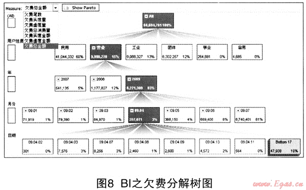 傳統(tǒng)的報表多以行列分布,很難實現(xiàn)數(shù)據(jù)層層展示,GDIA系統(tǒng)利用BI技術(shù)突破了傳統(tǒng)報表的框架。如圖8欠費分解樹為例,以用戶性質(zhì)作為第一層、年份作為第二層、月份作為第三層、日期作為第四層,不僅將欠費情況分解到不同的用戶性質(zhì),直觀的展現(xiàn)出欠費用戶的結(jié)構(gòu),同時還根據(jù)不同的年份、月份、日期讓管理者清晰的了解不同用戶性質(zhì)欠費年趨勢、月趨勢、年對比、月對比,便于管理者及時調(diào)整對策,增強欠款催討管理力度。