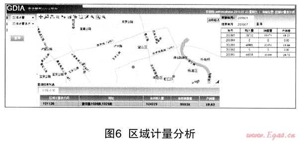 在GIS地理圖層上標定區(qū)域流量計,通過GDIA系統(tǒng)將兩數(shù)據(jù)源的數(shù)據(jù)進行整合,將《SCACA系統(tǒng)》流量計測點數(shù)與《客戶信息管理系統(tǒng)》中該區(qū)域用戶賬本信息配對綁定,清晰的反映抄表月份區(qū)域內(nèi)購入與實際銷售量的差異,高效地獲取區(qū)域產(chǎn)銷差的準確數(shù)據(jù),擺脫以往手工摘錄事后拼揍的統(tǒng)計方式,為職能部門與管理者提供區(qū)域產(chǎn)銷差分析基礎(chǔ)數(shù)據(jù)(見圖6)。