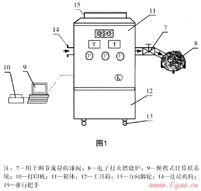 B. 箱體外觀:為在線實(shí)流檢測(cè)的方便性,將裝置設(shè)計(jì)為可移動(dòng)式箱體,箱體下部設(shè)有工具箱,以提高其便攜性。為了方便其移動(dòng),裝置箱體頂部設(shè)計(jì)有推行把手,箱體底部設(shè)有萬(wàn)向腳輪,箱體內(nèi)設(shè)有與檢定管路相連接的一臺(tái)或相并聯(lián)的一臺(tái)以上的標(biāo)準(zhǔn)表,標(biāo)準(zhǔn)表選用高準(zhǔn)確度氣體腰輪流量計(jì),檢定管路的進(jìn)氣端設(shè)有可與被檢表連接的連接機(jī)構(gòu),標(biāo)準(zhǔn)表前后及被檢表后均設(shè)有一段直管段,在每一臺(tái)標(biāo)準(zhǔn)表前的管路上均設(shè)有流量調(diào)節(jié)閥,為了提高測(cè)量準(zhǔn)確度,在標(biāo)準(zhǔn)表前設(shè)有凈化燃?xì)獾倪^(guò)濾器。在每一臺(tái)標(biāo)準(zhǔn)表前后的管路上設(shè)置有與便攜式計(jì)算機(jī)系統(tǒng)連接的壓力傳感器和溫度傳感器,在檢定管路的末端設(shè)有與其連接的燃燒爐,以保證防止大氣污染。