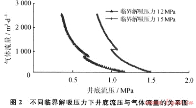 圖2顯示了在煤層供氣充足的條件下井筒中井底流壓與氣體流量的關(guān)系,可見井底流壓與氣體流量呈負(fù)相關(guān)關(guān)系,氣體流量隨井底流壓降低而增加。在解吸產(chǎn)氣初期,井底流壓下降快,但氣產(chǎn)量增長緩慢,表明產(chǎn)氣初期煤層壓降漏斗范圍小,供氣有限;隨著井底流壓不斷下降,地層壓降漏斗逐漸擴(kuò)大,井底流壓下降較小的值就能產(chǎn)出大量的煤層氣。煤層氣臨界解吸壓力越高,井底壓力下降相同的數(shù)值產(chǎn)出的氣體越多。這反映了煤層氣井的地下滲流壓力變化特征。