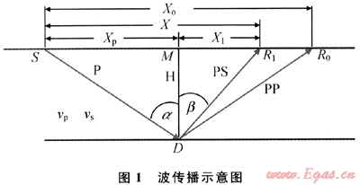 波場的反射與轉(zhuǎn)換是同時(shí)發(fā)生的,于共反射點(diǎn)處有一組不同偏移距縱波產(chǎn)生時(shí)相應(yīng)有一組共轉(zhuǎn)換橫波與之相伴而生??v波和轉(zhuǎn)換橫波同時(shí)向上傳播,到達(dá)地面后被儀器記錄下來。圖1為波的傳播路徑示意圖[2~5,8],界面深度為h,S為震源,由震源產(chǎn)生的下行P波遇到界面后,產(chǎn)生反射P波(P-P波)的同時(shí),又轉(zhuǎn)換形成反射SV波(P-SV波),然后上行傳播到地面(圖1)。其中,R0是P-P波地面接收點(diǎn),R1是P-SV波地面接收點(diǎn),D是界面反射點(diǎn)位置,M是地面共中心點(diǎn)位置。
