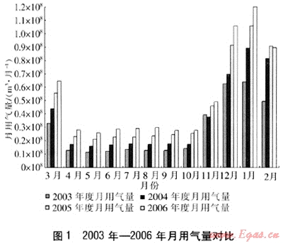 西安市2006年冬季在氣溫較高、幾乎沒有出現(xiàn)降雪的情況下,總用氣增量比前兩年明顯減少。影響用氣量變化的因素有:天氣變化、用戶規(guī)模和結(jié)構(gòu)的變化、節(jié)假日、人們的生活習(xí)慣等。