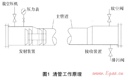 管道清掃時(shí),將具有一定過(guò)盈量的清管器置于管道中,使之外沿與管道內(nèi)壁形成良好的彈性密封,然后輸入介質(zhì)(通常為壓縮空氣或水),使清管器前后產(chǎn)生足夠的壓差,推動(dòng)清管器在管內(nèi)運(yùn)行(如圖1)。