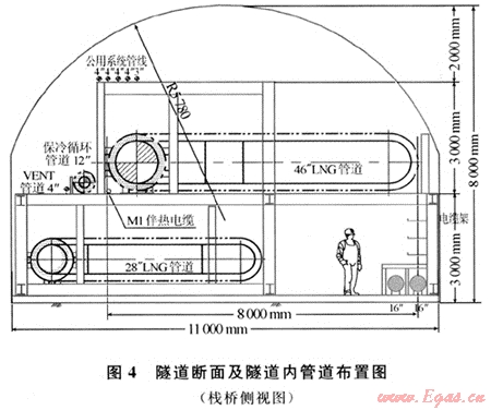 隧道內(nèi)包括管道區(qū)域和人員通道兩大區(qū)域。其中工藝管線包括46″(1168.4mm)的LNG卸料管道、28″(711.2 mm)的BOG回氣管道、12″(304.8mm)的保冷循環(huán)管道和4″(101.6mm)的排氣(VENT)管道,公用系統(tǒng)管道包括16″(406.4mm)的消防海水管道及其他小口徑的氮?dú)?、儀表風(fēng)、水管道及儀表電纜、電力電纜(參見(jiàn)圖4)。低溫管道均采用焊接連接,不設(shè)任何閥門(mén)或法蘭。此外,作為防冷凍保障方案,在LNG卸料管道底部的管架上,設(shè)置M1電纜進(jìn)行電伴熱,用于隧道通風(fēng)換熱不足情況下的安全保障,其設(shè)計(jì)能力為18.0W/m。
