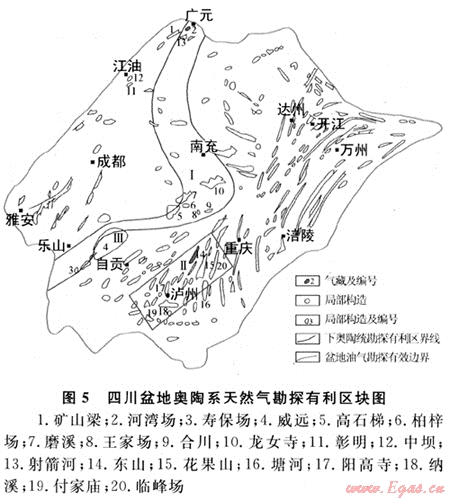 該區(qū)塊位于盆地中、西部,由廣元經(jīng)南充-樂山,向東呈鼻狀突出,面積約2.4×104km2(圖5)。從古地質(zhì)圖上可明顯看出,該區(qū)經(jīng)加里東期后的強烈剝蝕,下奧陶統(tǒng)已全面暴露地表,下奧陶統(tǒng)沉積時為碳酸鹽相向上變?yōu)樗樾紟r相,其底部常為碳酸鹽巖,經(jīng)鉆探證實女基井南津關(guān)組尚殘存有厚39m最容易溶蝕的生物灰?guī)r及鮞?;?guī)r,磨深1井和高科1井殘厚也分別達54.5m及22m,它們在長期遭受淡水溶蝕的情況下,必然會形成眾多古巖溶縫、洞。當(dāng)其被上覆的中二疊統(tǒng)棲霞組泥頁巖及致密灰?guī)r封蓋后,皆可成為良好的儲層。除已知局部構(gòu)造外,若區(qū)內(nèi)在古地形上,奧陶系儲層有殘丘或隆起,均可能是氣聚集的良好場所。甚至,由于古巖溶縫、洞的形成,并不受構(gòu)造和地域的限制,即使向斜內(nèi)如瀘州地區(qū)云錦向斜的云錦7井和云錦8井,在鉆入中二疊統(tǒng)茅口組儲層均有鉆具放空顯示,并獲得工業(yè)氣流,這就進一步提示我們在勘探奧陶系儲層時,不僅要注重背斜圈閉,在一定條件下還要從非背斜油氣藏的角度去考慮,這將更會有益于勘探。本區(qū)塊的局部構(gòu)造,有礦山梁、河灣場、龍女寺、磨溪以及高石梯等10余個構(gòu)造,可供勘探。尤其是本區(qū)塊北段,靠近天井山古隆起一帶,如前所述已發(fā)現(xiàn)較多巨型瀝青脈,這在全國來說也是罕見,經(jīng)淺井鉆探,于200m以下還有液態(tài)原油,也許該區(qū)地腹還可能有下寒武統(tǒng)九老洞組油藏存在。因此對該區(qū)奧陶系來說,最現(xiàn)實的是廣元河灣場構(gòu)造河深1井已發(fā)現(xiàn)工業(yè)氣流,與其相鄰的一些構(gòu)造也可能有奧陶系氣藏存在,值得重視。