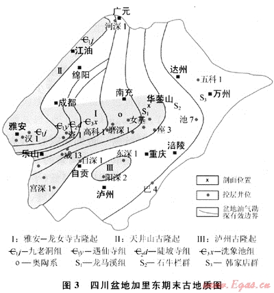 該古隆起西起雅安之西約100km與康滇古陸相接,向東經(jīng)資陽、南充、武勝-華鎣西龍女寺構(gòu)造傾沒(圖3),西高東低,長約460km,實為一個向東傾伏的巨型鼻狀古隆起。在其形成過程中,隨著運動的進程必然會在平行古隆起的軸向產(chǎn)生許多張性縫,此時也是燈影組和九老洞組的烴源巖達到生油高峰的時期。當(dāng)這些裂縫一旦穿達奧陶系儲層并進入上寒武統(tǒng)洗象池群(該群氣源層與奧陶系相同,截至2004年于威遠氣田已有11口井獲工業(yè)性氣流,其中6口井氣產(chǎn)量皆在10×104m3/d以上),因此很可能此時已有油氣聚集于奧陶系儲層中。但由于平行古隆起方向的裂縫,一般都是斷續(xù)或疏密不均,以及古隆起軸、頂部儲集空間的多寡等,而導(dǎo)致晚期生成的一些油氣滯留于距古隆起較低或較遠的奧陶系儲層中。即使喜馬拉雅山造山運動形成了眾多不同類型的構(gòu)造帶、局部構(gòu)造和斷裂,也很難徹底改變這一狀態(tài)。例如女基井并未鉆在龍女寺構(gòu)造圈閉內(nèi),而是鉆在該構(gòu)造南翼圈閉線外7km的向斜中,當(dāng)鉆到下奧陶統(tǒng)南津關(guān)組時,于井深4525~4530.5m,巖性為生物灰?guī)r,局部為鮞?;?guī)r,發(fā)生氣侵。同樣,位于其南的合川構(gòu)造合12井,鉆達下奧陶統(tǒng)南津關(guān)組時,于井深4355~4358m發(fā)生井涌,巖性為石灰?guī)r,泥漿池氣泡面積達60%,遺憾的是對這兩口井均未進行測試。