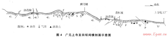 該古隆起位于盆地西北緣,曾經(jīng)云貴和冶里兩次地殼運動[14],在青藏古陸與龍門山深大斷層接壤處,形成的一北東向盆地邊緣古隆起,因于20世紀60年代在廣元-江油間的天井山構(gòu)造首先發(fā)現(xiàn)而命名。清晰可見下寒武統(tǒng)九老洞組(或稱筇竹寺組)砂、頁巖露頭,呈兩翼近于對稱的標準背斜橫剖面,其上為中二疊統(tǒng)石灰?guī)r覆蓋。顯然,是于志留紀末發(fā)生的加里東造山運動造就的古隆起,經(jīng)嚴重剝蝕導(dǎo)致,向古隆起外側(cè)在磨刀埡西北,可見到泥盆系、石炭系覆于奧陶系石灰?guī)r之上,其間缺失志留系。在上寺之西的田壩,于1950~1960年曾開采瀝青(最初認為是煤)煉油、煉焦,“采出瀝青數(shù)萬斤,煉出油1000余斤”。筆者有幸前往調(diào)查,證實九老洞組頁巖夾砂巖內(nèi),確有4條巨型瀝青脈,最寬者為6~7m。緊接著地調(diào)處便派隊前往對其進行了詳查(表3、4和圖4)[15]。
