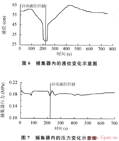 由圖6、7可知,在這一工況中,液位控制系統(tǒng)啟動(dòng)前,捕集器內(nèi)液位會(huì)慢慢降低,直至最低,在液位低于30cm時(shí),就會(huì)有大量氣體從捕集器液體出口溢出,導(dǎo)致捕集器內(nèi)壓力不穩(wěn)定。液位控制系統(tǒng)啟動(dòng)后,液位先增高然后逐漸達(dá)到穩(wěn)定工況,捕集器內(nèi)壓力也趨于平穩(wěn),沒有大幅度的上升或降低。