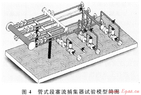 實(shí)驗(yàn)環(huán)道的主要設(shè)備是管式液塞捕集器,根據(jù)實(shí)驗(yàn)流量,設(shè)計(jì)為4管式,結(jié)構(gòu)形式與目前生產(chǎn)用的一致。其三維模型如圖4所示。