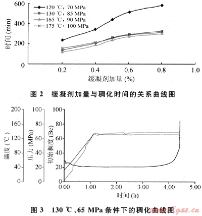 高溫緩凝劑WHJ對(duì)水泥漿稠化時(shí)間的影響實(shí)驗(yàn)結(jié)果見圖2、圖3。