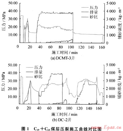 2000型壓裂車及XJ-250型修井機、ACF-700型洗井泵車、數(shù)據(jù)采集與監(jiān)控車等設(shè)備完成壓裂工作量7層次,共計加入蘭州產(chǎn)0.5~1.2mm石英砂167.17m3,共使用前置液、攜砂液及頂替液2783.17m3,C25煤層砂比為8.0%~10.8%,C19+C23煤層砂比為4.3%~11.6%。