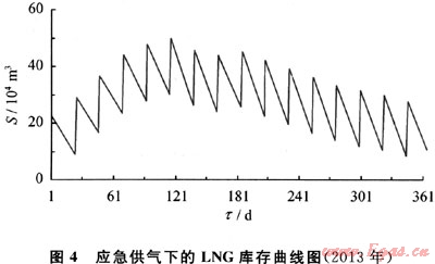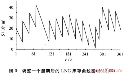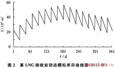 2) 應用動態(tài)數學模型,通過LNG庫存曲線(圖3)可知所需罐容為41.87×104m,若選用常規(guī)l6×104m的儲罐,應配置2.62個儲罐,取整為3個儲罐;若選用18×104m的儲罐,則應配置2.33個,取整為3個儲罐。由此可見,采用靜態(tài)模型計算均勻來船情況下的LNG儲罐罐容尚且合理,而一旦來船期變化較大,靜態(tài)模型計算結果明顯不合理。而動態(tài)數學模型的計算結果更為合理。