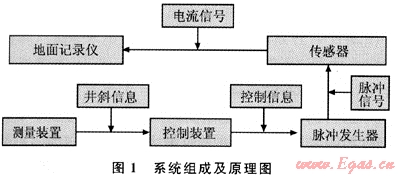 圖1是整個(gè)系統(tǒng)的組成及工作原理圖。整個(gè)系統(tǒng)的工作原理是:井下儀器的測(cè)量裝置測(cè)得的井斜信息通過(guò)一定的機(jī)構(gòu)傳遞給控制裝置,控制裝置將井斜信息轉(zhuǎn)換為控制信息,從而控制脈沖發(fā)生器產(chǎn)生脈沖信號(hào),脈沖信號(hào)通過(guò)鉆井液傳遞到地面,立管上的傳感器檢測(cè)到壓力脈沖信號(hào)并由地面記錄儀打印出來(lái),并根據(jù)脈沖信號(hào)的數(shù)量顯示出井斜的大小。