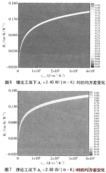 運(yùn)用參數(shù)估計(jì)法,給λs賦值:1.92、2.40、2.88W/(m·K),在參數(shù)估計(jì)中,分別對(duì)cp,s、Rb在一定的取值范圍內(nèi)連續(xù)賦值。通過(guò)計(jì)算機(jī)編程計(jì)算得到模擬工況下的均方差變化情況見(jiàn)圖12~14,圖右側(cè)色標(biāo)為均方差。由圖12~14可知,模擬工況下的結(jié)果不理想,均方誤差較小的淺色云圖中深色區(qū)域?qū)?yīng)多組cp,s、Rb,這樣就很難確定哪組數(shù)值是最優(yōu)值,即在參數(shù)估計(jì)中對(duì)其他參數(shù)的影響比較大。