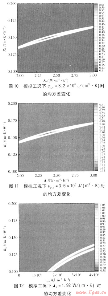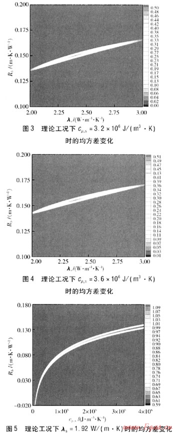由圖2~4、9~11可知,均方差最小值的區(qū)域基本固定,其對(duì)應(yīng)的λs在2.4W/(m·K)左右。因此,可以得出結(jié)論,在實(shí)際過(guò)程中即使存在一些不確定因素的影響,得到的模擬值與理論值存在一定的偏差,但是經(jīng)過(guò)參數(shù)估計(jì)處理得到cp,s的變化對(duì)結(jié)果的影響也很小,cp,s偏差±12.5%對(duì)λs的影響在±2%左右。通常情況下cp,s的獲得可以依據(jù)現(xiàn)場(chǎng)鉆孔中心巖土分析來(lái)確定,相對(duì)誤差一般在±5%以?xún)?nèi),對(duì)λs的影響更小。
