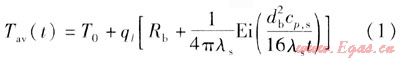 地埋管換熱器的傳熱模型主要有線熱源模型、柱熱源模型。線熱源模型是基于1948年Ingersoll和Plass等人發(fā)展的Kelvin線熱源理論[8]。工程上常見(jiàn)的地埋管換熱器的直徑一般為26~36mm,鉆孔深度為40~200m,與鉆孔深度相比,地埋管的直徑很小。在地埋管換熱器工作時(shí),相當(dāng)于在半無(wú)限大介質(zhì)中,鉆孔中心的一根線熱源與周?chē)鷰r土進(jìn)行熱交換。另外,假設(shè)沿地埋管長(zhǎng)度方向傳熱量忽略不計(jì),周?chē)鷰r土均勻且線熱源與巖土的傳熱量恒定。由于該方法不受具體換熱器形式的限制,計(jì)算較簡(jiǎn)單,且能滿足一般工程中土壤源熱泵系統(tǒng)設(shè)計(jì)計(jì)算的要求,具有較廣泛的實(shí)用性。根據(jù)假設(shè),可以得到地埋管內(nèi)流體平均溫度與鉆孔周?chē)鷰r土初始平均溫度及其他參數(shù)之間的關(guān)系式[9]