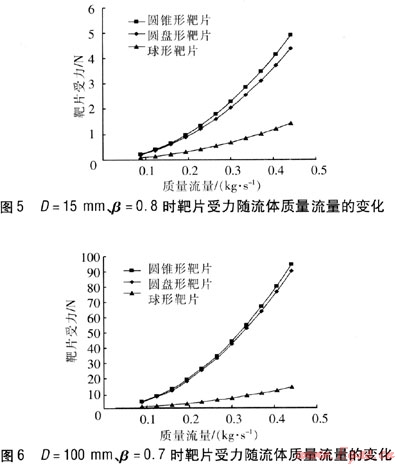 不同D、β下3種靶片受力隨流體質(zhì)量流量的變化見(jiàn)圖5、6。由圖5、6可知,在相同質(zhì)量流量下,靶片受力由尺到小依次是圓錐形、圓盤形、球形。不同質(zhì)量流量下流體流經(jīng)3種靶片的壓力損失見(jiàn)表1、2。由表1、2可知,隨著質(zhì)量流量的增加,流體流經(jīng)靶片的壓力損失也逐漸增加。相同質(zhì)量流量時(shí),流經(jīng)圓盤形、圓錐形靶片的壓力損失接近,但大于球形。在D、β相同的情況下,圓錐形靶片與流體接觸的面積較大,而圓盤形靶片后部流體分離嚴(yán)重,因此二者對(duì)流體的擾動(dòng)比較大,靶片受力較大,因渦流導(dǎo)致的壓力損失也相對(duì)較大。球形表面光滑,當(dāng)流體通過(guò)時(shí),狀態(tài)改變緩慢,對(duì)流體影響較小,因此其受力與流體壓力損失相對(duì)較小。因此,若要求靈敏度高(小流量)時(shí),希望靶片受力大些,宜選用圓盤形靶片和圓錐形靶片。若要求靈敏度低(大流量)時(shí),宜選用球形靶片。