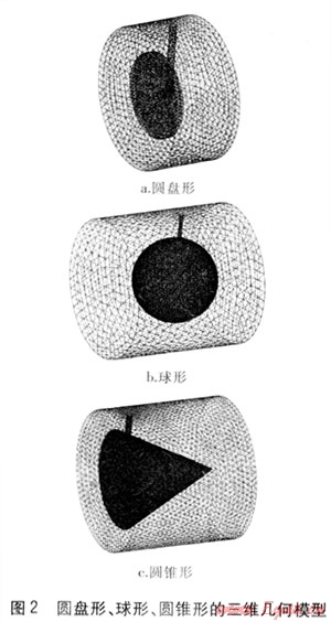本文主要對(duì)圓盤形、球形、圓錐形靶片進(jìn)行模擬分析。由FLUENT前處理軟件GAMBIT建立的這3種形狀靶片的三維幾何模型見(jiàn)圖2,流體的流動(dòng)方向?yàn)樽宰笙蛴摇?/span>