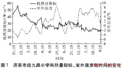 以濟(jì)南市經(jīng)九路小學(xué)為例,測試日期為2010年1月20日至28日,耗熱量指標(biāo)、室外溫度隨時(shí)間的變化見圖1。