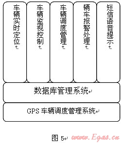 GPS系統(tǒng)主要功能有車輛實(shí)時定位、車輛監(jiān)視控制、車輛調(diào)度管理、車輛報警處置、短信語音通信等。功能結(jié)構(gòu)見圖5:
