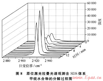 圖8是由SDS水溶液合成的甲烷水合物的分解過程拉曼譜圖。譜圖范圍在2850~2950cm,主要觀測了水合物的分解過程中甲烷分子的拉曼譜圖變化。從圖中可以看出,由SDS溶液合成的甲烷水合物也為Ⅰ型結構水合物,與干水甲烷水合物分解過程類似,隨著水合物的不斷分解大、小籠中甲烷分子的拉曼雙峰發(fā)生了與干水甲烷水合物相同的變化,甲烷雙峰呈現此消彼長的過程,并最終變?yōu)閱畏濉?/span>